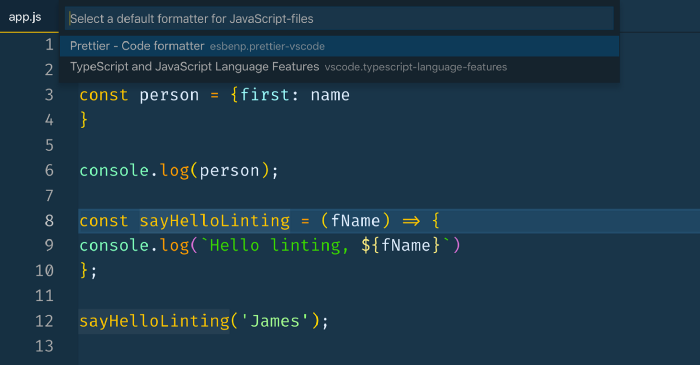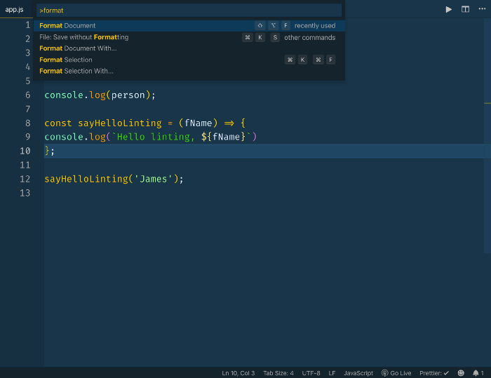 Sau khi cài đặt xong Prettier, chúng ta có thể sử dụng nó để format code ngay lập tức. Chúng ta sẽ config nó cụ thể ở phần sau, nhưng để bắt đầu, chúng ta sẽ thử sử dụng Format Command.
