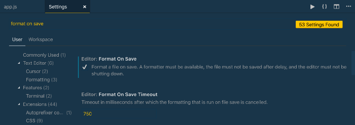 Bên trên chúng ta đã chạy command thủ công để format code. Giờ, chúng ta có thể sử dụng setting của VS Code để tự động format code của bạn mỗi lần Save, bạn sẽ không cần phải lo việc format code bất kì lần nào nữa, VS Code sẽ tự động làm việc đó cho bạn.