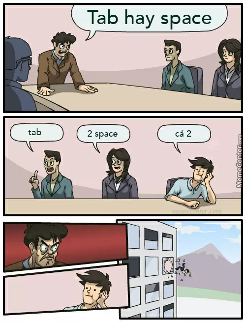 Có người thích dùng tab, người khác lại dùng 2 hoặc 4 dấu space để thụt dòng. Bên cạnh việc không thống nhất là bao nhiêu space còn có sự tranh cãi giữa dùng tab và dùng space. Vì sao lại xảy ra tình trạng tranh cãi, ai thích dùng gì thì dùng chứ. Đó là vì có ý kiến cho rằng gõ 2 dấu cách mới là code chuẩn, còn dùng tab thì không. Nên dùng 2 spaces hay dùng tab?