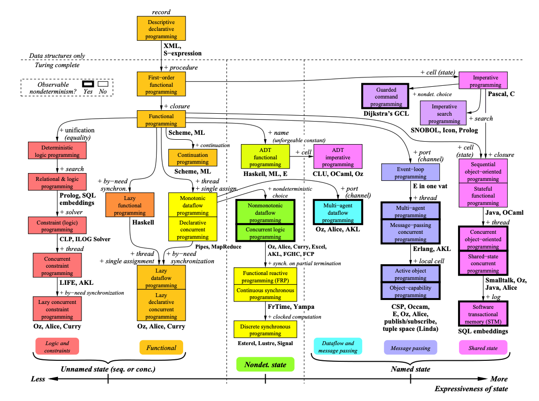 Imperative Programming hay Declarative Programming đều được gọi chung là cơ chế hay mô hình lập trình (Programming Paradigm). Mà cụ thể các bạn xem mô hình tổng hợp quan hệ giữa các cơ chế lập trình trong cuốn "Programming Paradigms for Dummies: What Every Programmer Should Know" của tác giả Peter Van Roy bên dưới: