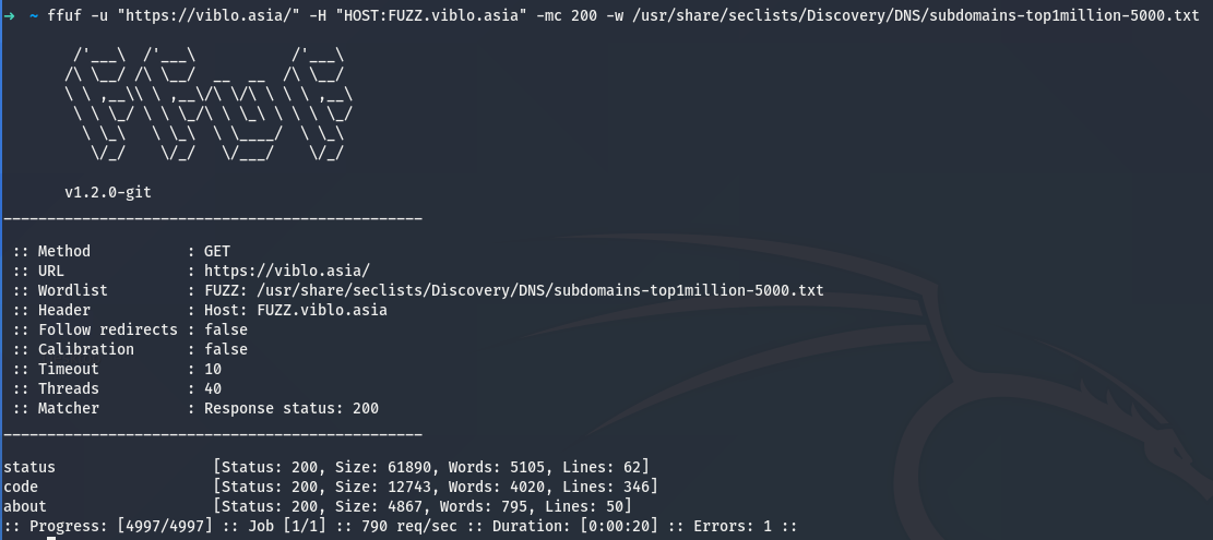 ffuf -u "https://viblo.asia/" -H "HOST:FUZZ.viblo.asia" -mc 200 -w /usr/share/seclists/Discovery/DNS/subdomains-top1million-5000.txt