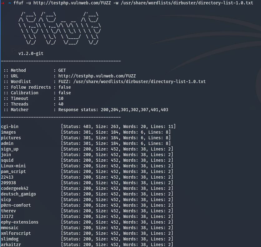 ffuf -u http://testphp.vulnweb.com/FUZZ -w /usr/share/wordlists/dirbuster/directory-list-1.0.txt