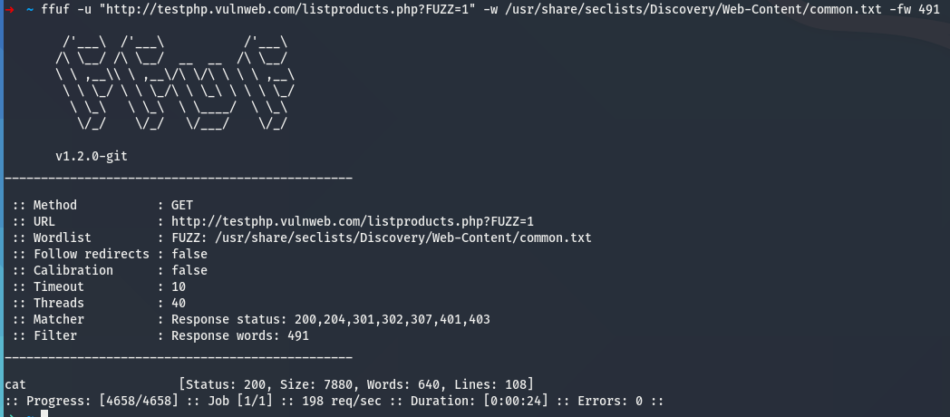 ffuf -u "http://testphp.vulnweb.com/listproducts.php?FUZZ=1" -w /usr/share/seclists/Discovery/Web-Content/common.txt -fw 491