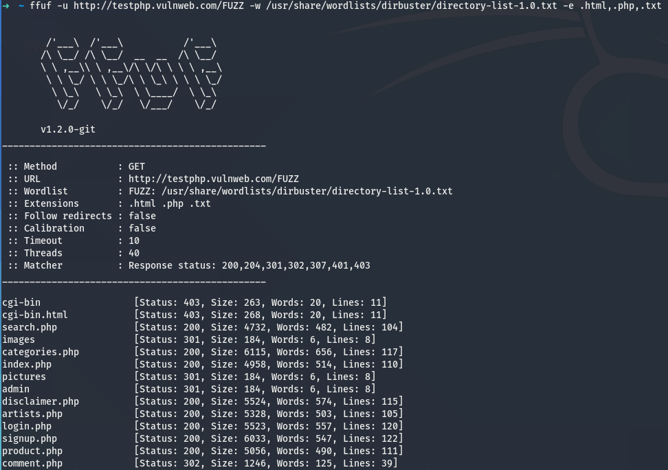 ffuf -u http://testphp.vulnweb.com/FUZZ -w /usr/share/wordlists/dirbuster/directory-list-1.0.txt -e .html,.php,.txt