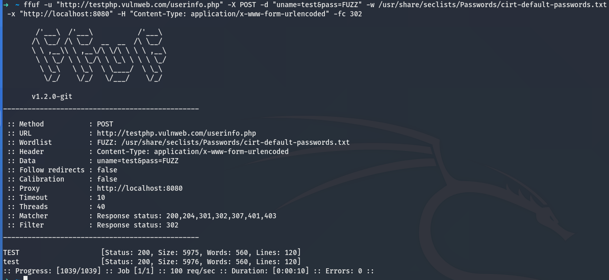 Dưới đây là một ví dụ về việc sử dụng POST data để brute password của một form login. Với POST data chúng ta cần sử dụng option -X để đổi method của ffuf(default là GET), các dữ liệu trong form chúng ta cần dùng option -d, ngoài ra việc fuzzing chúng ta nên sử dụng thread để tăng tối đa tốc độ fuzz. Hầu hết những tool fuzz, scan đều hỗ trợ chạy đa luồng và ffuf cũng vậy, có thể sử dụng nó bằng option -t để tăng thread, nhưng việc tăng thread rất dễ dẫn đến bạn bị block vì gửi quá nhiều request, vì vậy cần tăng nên mức hợp lý nhất có thể để tránh việc block gây ra những error request.