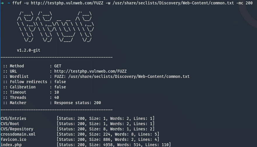 ffuf -u http://testphp.vulnweb.com/FUZZ -w /usr/share/seclists/Discovery/Web-Content/common.txt -mc 200