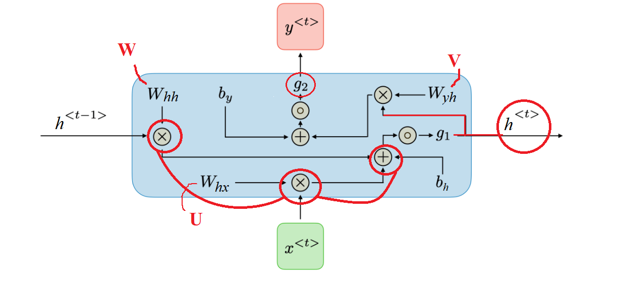 ht=g1(Whhht1+Whxxt+bh) h_{t} = g1 ( W_{hh} * h_{t-1} + W_{hx} * x_{t} + b_{h} )