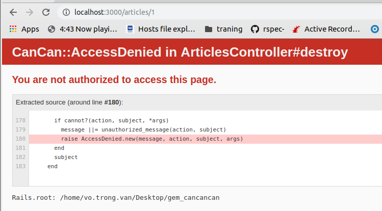 Phương thức authorize! trong controller sẽ xuất ra một ngoại lệ nếu user không có quyền sử dụng tài nguyên