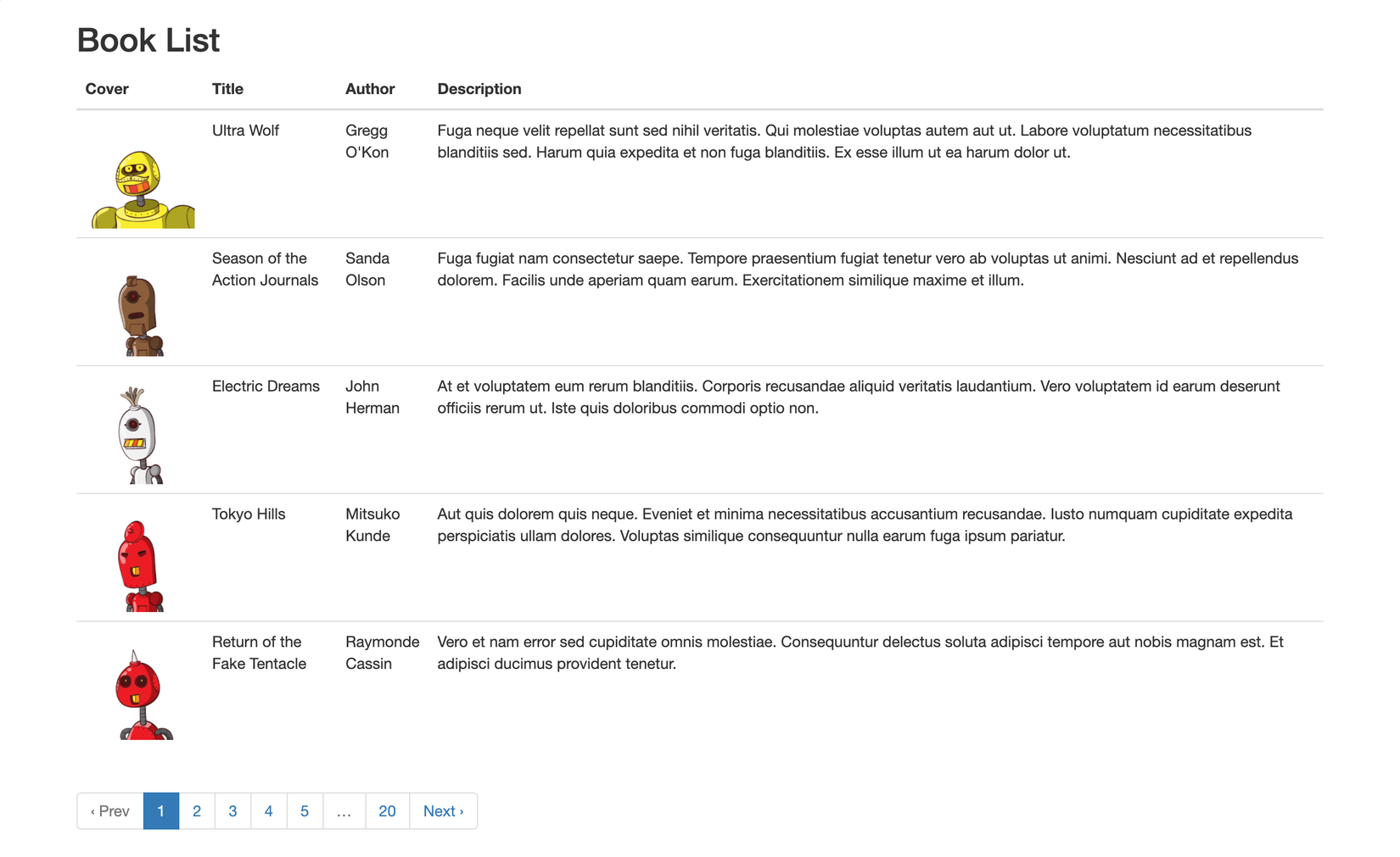 pagycung cấp các front extra và các helper method tương ứng tùy theo thư viện để render pagination trên Front-end - Ví dụ sử dụng bootstrap