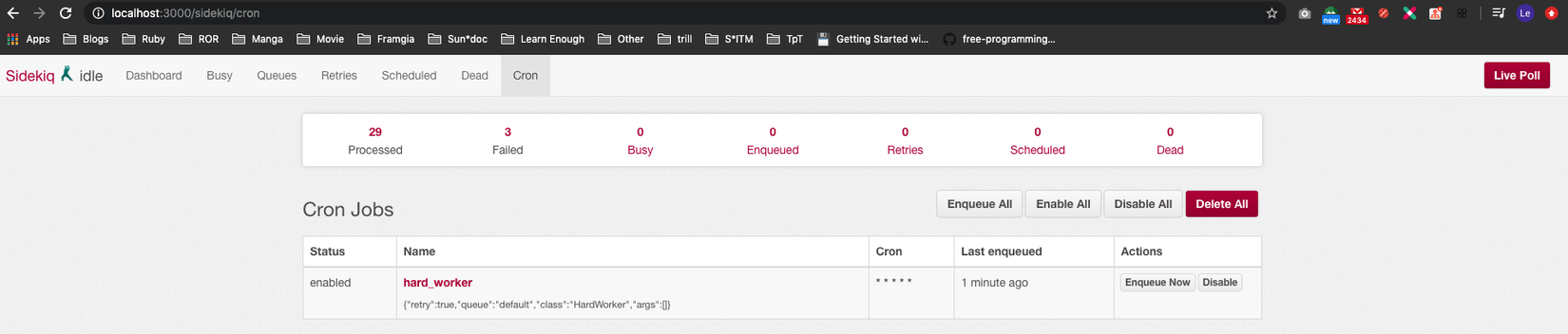 sidekiq/cron/webvào route để xem danh sách cron job với sidekiq UI.# config/routes.rb require "sidekiq/web" require "sidekiq/cron/web" Rails.application.routes.draw do mount Sidekiq::Web => "/sidekiq" end