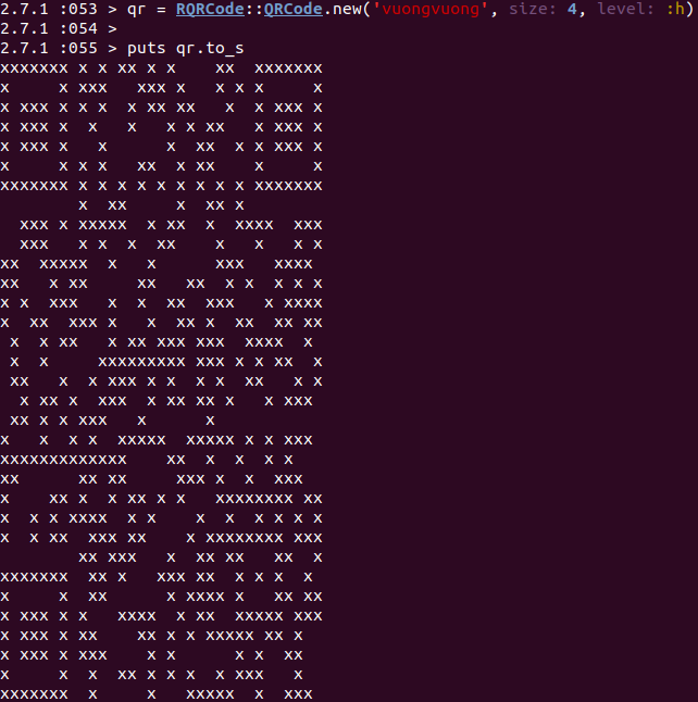 qr = RQRCode::QRCode.new('vuongvuong', size: 4, level: :h)