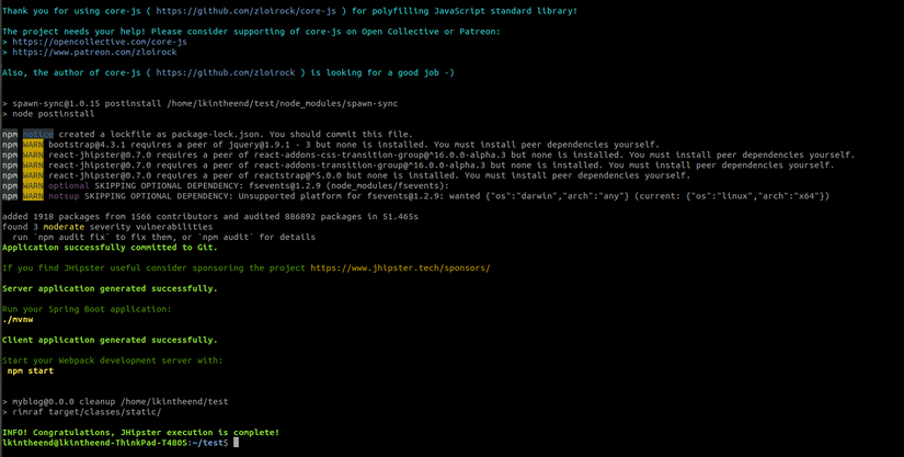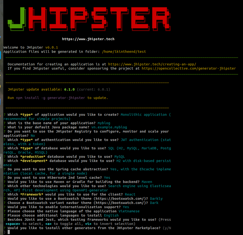 Sau đó sử dụng lệnh sau để jhipster bắt đầu generate code: jhipsterhoặc nếu bạn muốn sử dụng vuejs cho frontend thì bạn hãy sử dụng lệnh sau: jhipster --blueprint vuejs