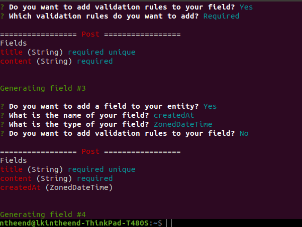 Sau đó jhipster sẽ hiện lên các các câu hỏi để bạn có thể tùy chọn tên các trường, kiểu dữ liệu của các trường, validate và cả kiểu quan hệ với các entity khác nữa. ![]()