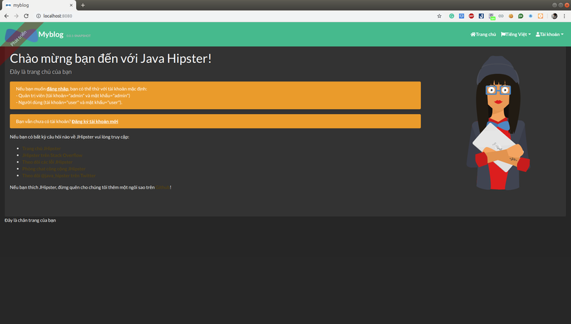 Lúc này web đã chạy thì bạn có thể đăng nhập vào bằng tài khoản admin/admin nhé. Có thể bạn sẽ ngạc nhiên với những gì mà jhipster đã generate ra cho bạn đó