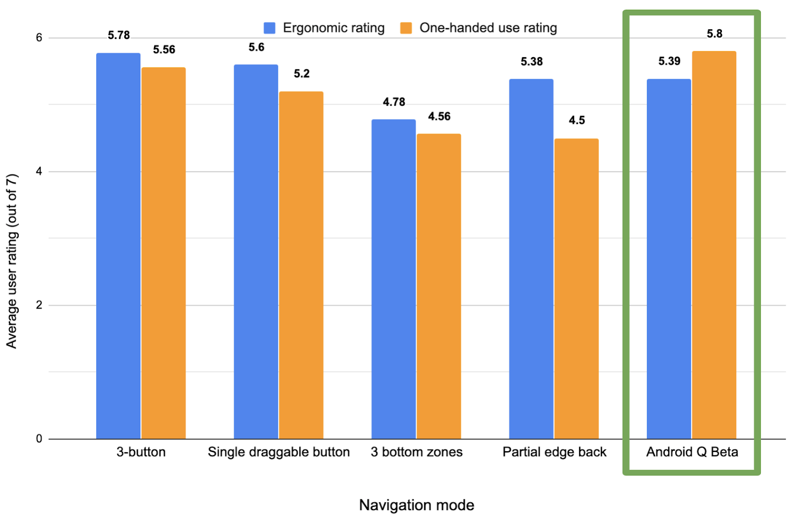 So sánh xếp hạng của người dùng về công thái học và sử dụng bằng một tay trên các chế độ điều hướng khác nhau (cao hơn là tốt hơn)