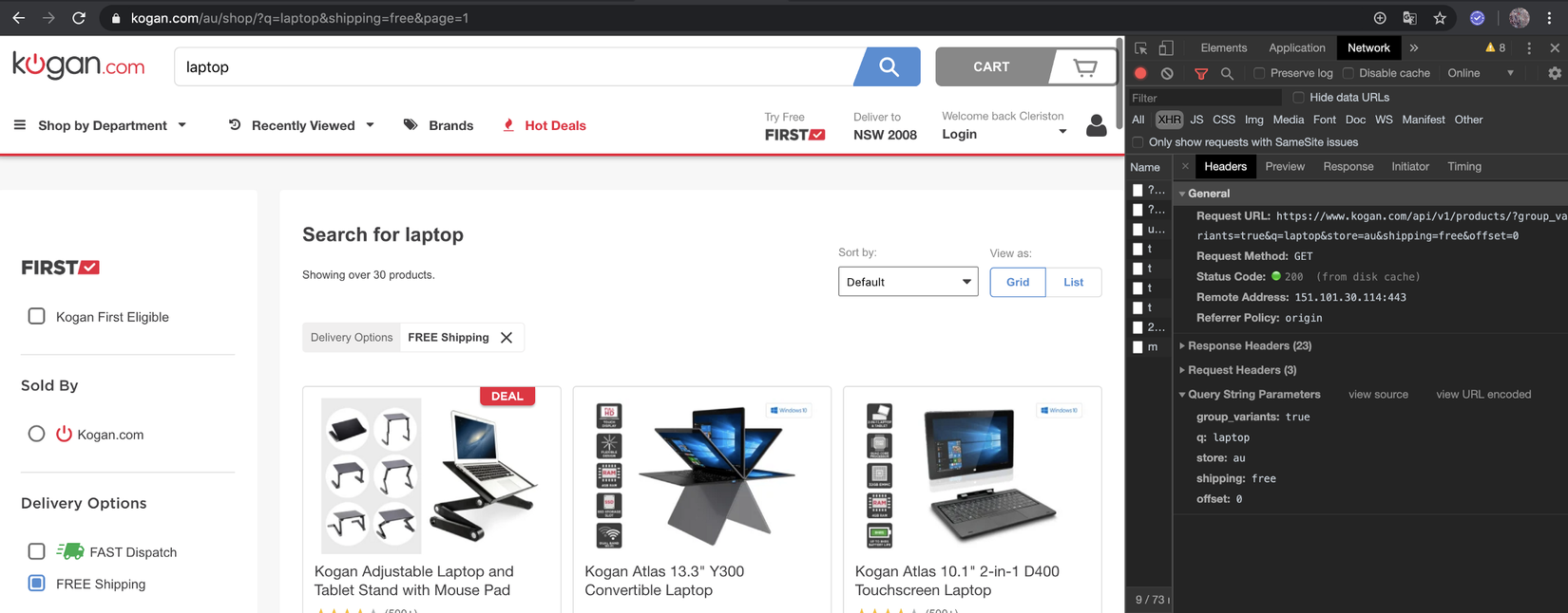 A. Truy cập https://www.kogan.com/au/shop/?q=laptop và click vào filter bất kì (ví dụ "Free shipping"). Trang web sẽ thực hiện GET request mới, lấy dữ liệu mới, hiển thị lại danh sách sản phẩm, cập nhật địa chỉ URL của trình duyệt và lưu URL vào lịch sử trình duyệt. Mặc dù trang web không được refresh, đường dẫn mới vẫn được đẩy vào lịch sử trình duyệt, do đó bạn vẫn có thể điều hướng trở lại trang đầu tiên.