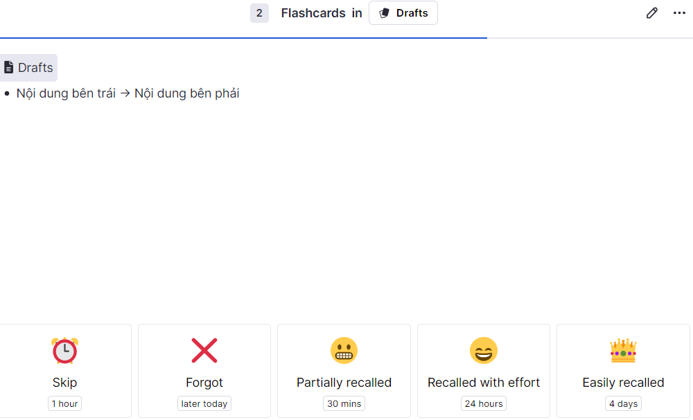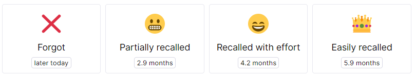 Cái giá trị nhất ở RemNote mình thấy là khả năng cho phép mình trả lời các flashcard kia với phương phápSpaced Repetition. Với mỗi card khi thực hiện trả lời, mình sẽ lựa chọn icon tương ứng với tốc độ và khả năng nhớ đầy đủ câu trả lời đó của mình. Cái gì mình nhớ tốt thì khi mình chọn nút tương ứng, card đó sẽ càng được giãn thời gian quay lại pool để hỏi lại mình hơn.