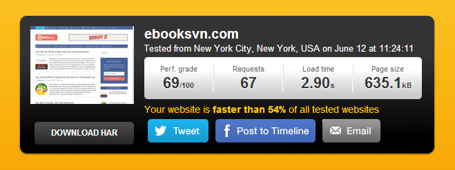 Ngay bên dưới là phần nhận xét tổng thể. Blog này nhanh hơn 54% so với tất cả các blog/ website đã thử nghiệm. Bạn cũng sẽ thấy bốn tab – Waterfall, Performance Grade, Page Analysis và History.