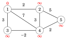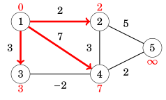 Ở vòng lặp đầu tiên, ta cập nhật được đường đi ngắn nhất thông qua các cạnh (1, 2); (1, 3); (1, 4):