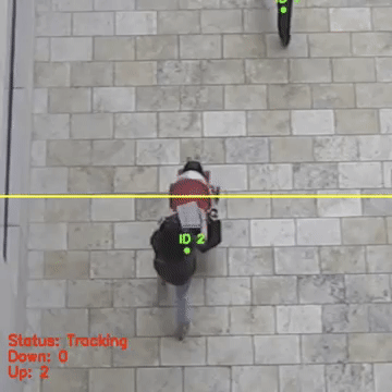 Mô hình này rất đơn giản bao gồm camera được gắn vào phía trên của cửa ra vào trong phòng họp. Khi có người qua lại thì bộ đếm sẽ tự đồng cộng giá trị (trong trường hợp có người vào phòng) hoặc trừ giá trị (trong trường hợp có người ra khỏi phòng). Bọn mình đã bắt tay ngay vào việc thử nghiệm các giải thuật detect (phát hiện người) và tracking (theo dõi đối tượng đã được detect) để xác định chiều di chuyển như mong muốn. Bước đầu giải pháp này được kì vọng sẽ đem lại độ chính xác khá tốt so với những giải pháp khác. Mọi người có thể hình dung giải pháp này như ảnh bên dưới
