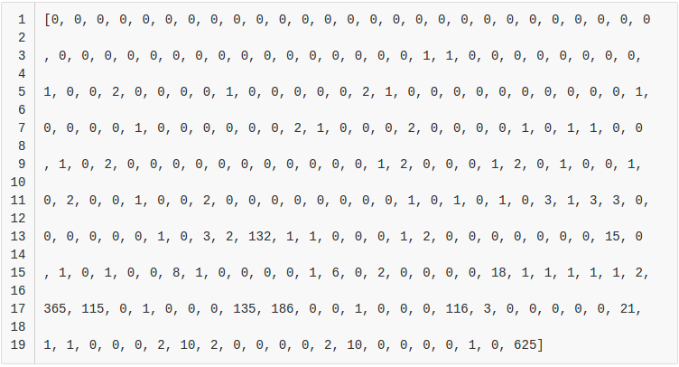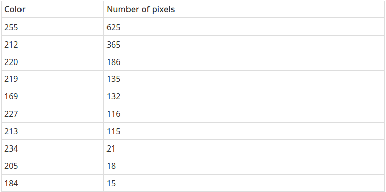 Ở đây chúng ta thấy số pixel của mỗi màu trong số 255 màu trên ảnh. Bạn có thể thấy rằng màu trắng (255, số cuối cùng) được tìm thấy thường xuyên nhất. Nó được theo sau bởi màu đỏ (văn bản). Để xác minh điều này, chúng ta sẽ viết một đoạn script nhỏ: