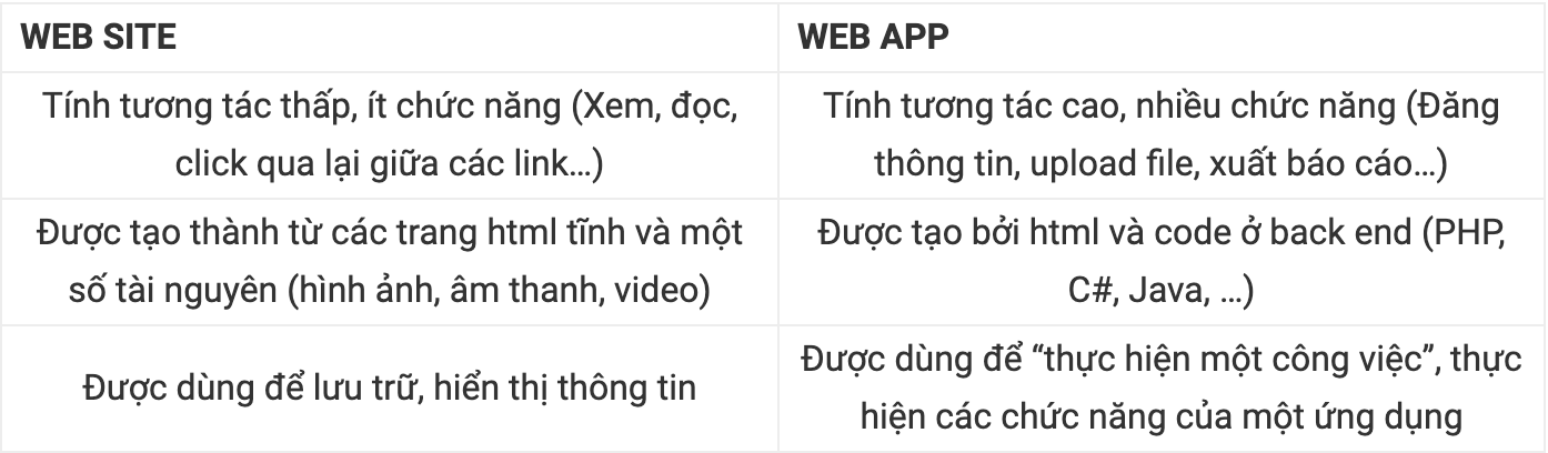 Nói dễ hiểu, web app là những ứng dụng chạy trên web. Thông qua web app, người dùng có thể thực hiện một số công việc: tính toán, chia sẻ hình ảnh, mua sắm … Tính tương tác của web app cao hơn website rất nhiều.