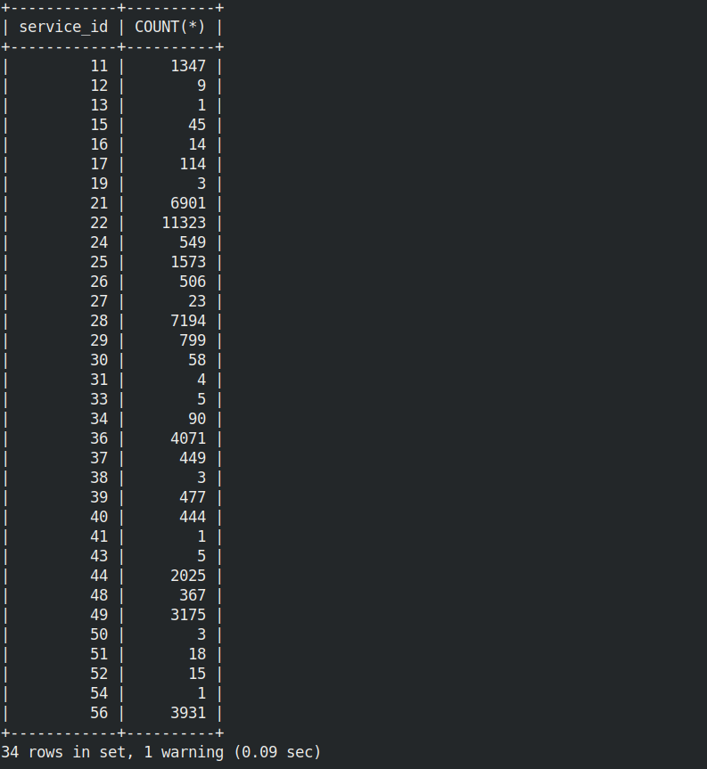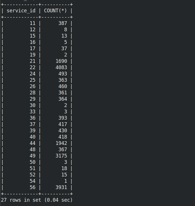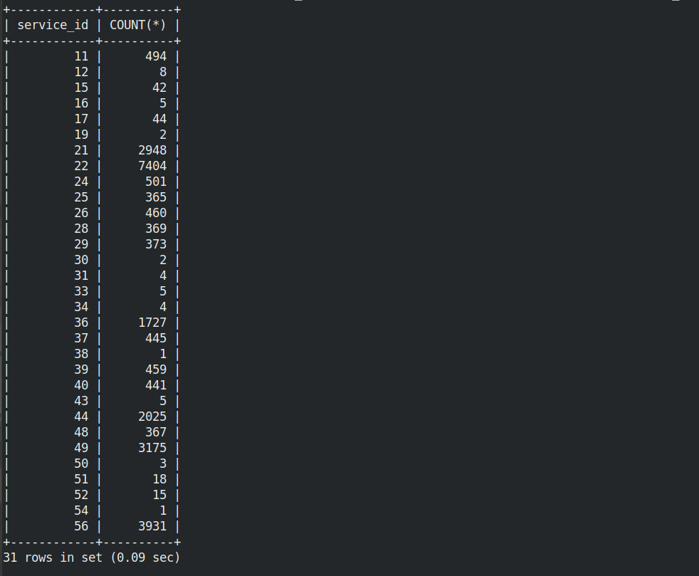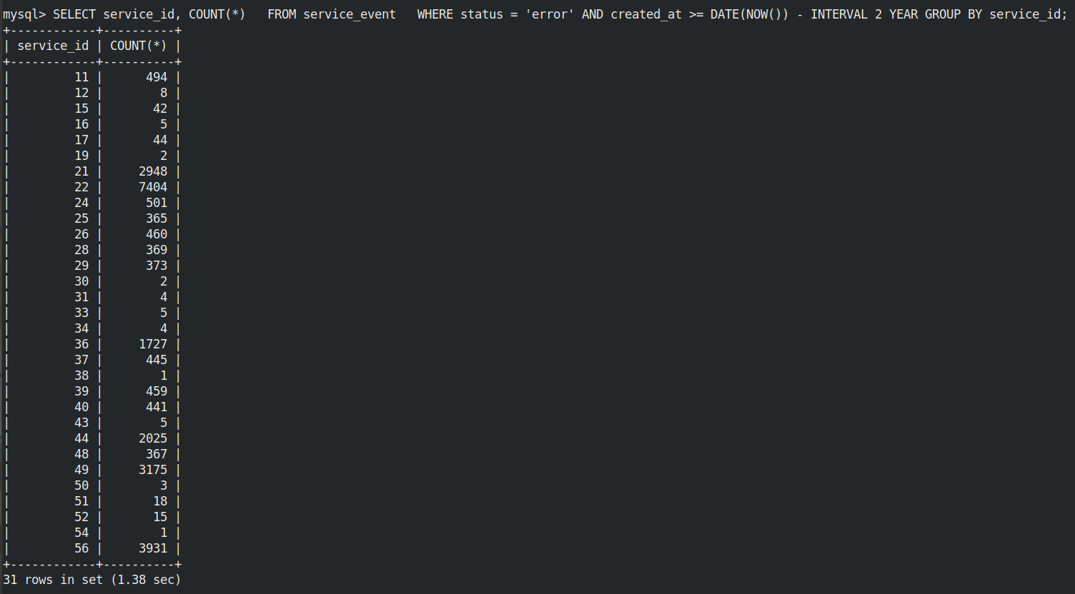 WHERE status = 'error' AND created_at >= DATE(NOW()) - INTERVAL 2 YEAR GROUP BY service_id \G;