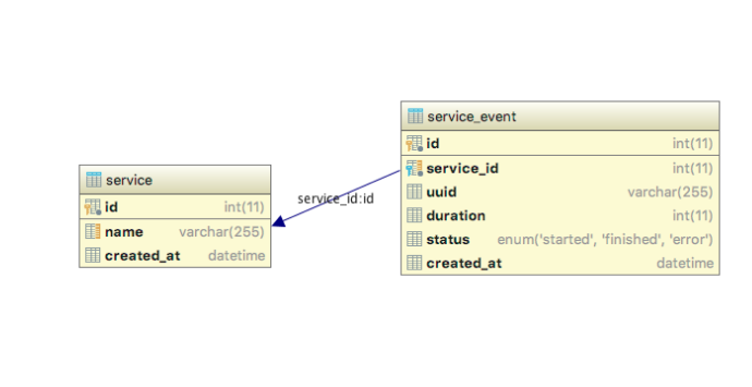 servicevàservice_eventcó cột ID làprimary keyvà đây là index mặc định cho 2 bảng này. Ngoài ra trong bảngservice_event, còn cóforeign keylà service_id, cũng là index cho bảng này. Trong quá trình tạo khóa ngoại, MySQL sẽ không tự tạo index cho khóa ngoại. Vì vậy, nếu foreign key trong các bảng không được đánh index thì mọi người nên đánh index cho trường này.