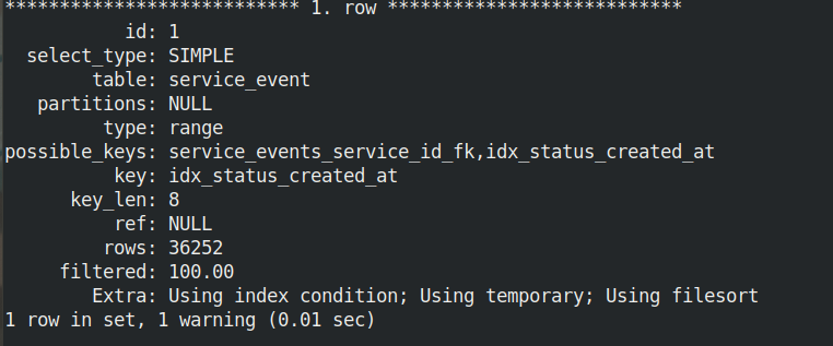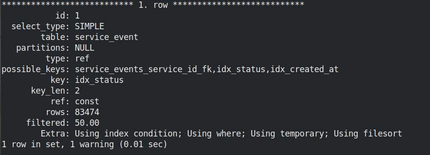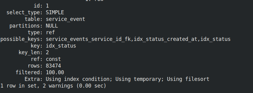 - Có thể thấy, trường possible_key đã có thêm những index mình vừa mới tạo đó là: idx_status và idx_created_at, trường key đã có sự thay đổi đó là sử dụng index idx_status thay vì sử dụng index service_events_service_id_fk. Và số lượng record mà MySQL đã đọc giảm từ 777896 xuống 83474, một con số khá ấn tượng. Nhưng vẫn còn có khá nhiều so với output của câu query là 31 record. Vậy tại sao lại như vậy ?