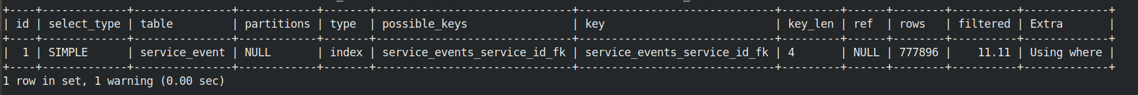 service_events_service_id_fk. - key: Index được sử dụng để tìm ra những bản ghi thỏa mãn điều kiện. Trong trường hợp này, thì index được sử dụng là service_events_service_id_fk.