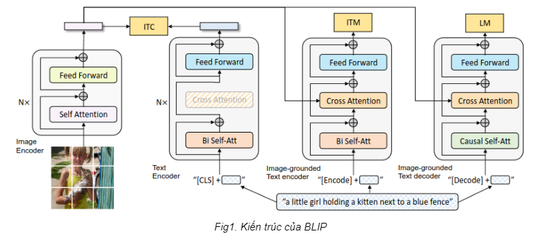 Về mặt kiến trúc, mô hình BLIP kết hợp 3 khối Image Encoder, Text Encoder và Text Decoder để thực hiện những tác vụ xử lý đồng thời hình ảnh và ngôn ngữ (Fig1). Hiểu đơn giản thì các khối sẽ chia sẻ “kiến thức” với nhau, cho phép mô hình có thể hiểu được dữ liệu (do Image Encoder và Text Encoder đảm nhiệm) và trả lại đầu ra tương ứng (do Text Decoder đảm nhiệm).