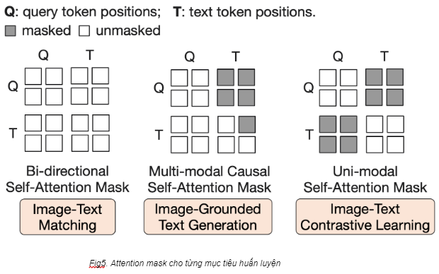 Trong giai đoạn 1, BLIP-2 có 3 mục tiêu huấn luyện, mỗi mục tiêu sẽ áp dụng một attention masking khác nhau cho lớp self-attention. Cụ thể là: