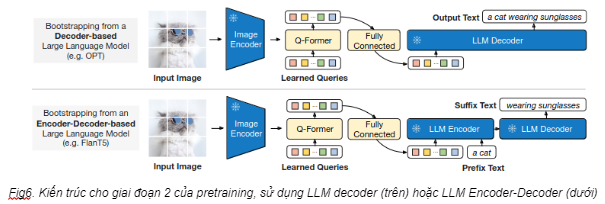 Sau giai đoạn 1, ta sẽ thu được một Q-Former có khả năng “mô tả bức ảnh". Hiểu nôm na là bây giờ ông Q-Former đã “hiểu” và sẵn sàng “dịch" cho ông LLM những gì ông Image Encoder “nói”. Tất nhiên là đầu ra của Q-Former không dùng trực tiếp cho LLM được (vì khác biệt trong chiều của data). Thay vào đó, query embedding sẽ phải chạy qua một khối Fully Connected (FC) để biến đổi tuyến tính, sao cho phù hợp làm đầu vào của LLM. Nói cách khác thì query embedding sau khi chạy qua lớp FC sẽ hoạt động tương tự như mô tả của bức ảnh (soft visual prompt) để đưa vào LLM. Ở giai đoạn 2 này, việc “học" sẽ diễn ra chủ yếu với khối FC, mục tiêu là để LLM tạo ra câu trả lời mong muốn dựa trên query embeddings thu được từ Q-Former (vì LLM đã frozen nên chỉ có thể huấn luyện lớp FC). Ở trong Fig6, nhóm tác giả có thử nghiệm với 2 loại LLM: decoder-based và encoder-decoder-based. Đối với decoder-based, đầu ra của khối FC sẽ làm đầu vào của LLM. Đối với encoder-decoder-based, nhóm nghiên cứu “cắt" phần đầu của output mong muốn (prefix) và kết hợp với query embeddings để làm đầu vào của LLM (đầu ra tất nhiên là phần còn lại của output).