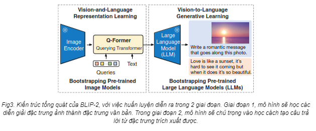 Tóm lại, việc pre-train của Q-Former diễn ra thành 2 giai đoạn và có thể hiểu như sau: Trong giai đoạn 1, Q-Former sẽ học cách trích xuất từ bộ đặc trưng của ảnh thành queries embedding sao cho thông tin thu thập được liên quan đến văn bản nhất. Sau đó, trong giai đoạn 2, queries embedding sẽ được “dịch" thành prompt (tương tự như việc mô tả bức ảnh). Trọng tâm của giai đoạn 2 là để khối FC học cách “dịch" queries embedding sao cho LLM tạo được đầu ra mong muốn. Chi tiết cách hoạt động các bạn có thể tham khảo thêm ở paper.