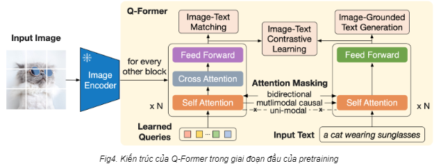 Ở giai đoạn 1, Q-Former sẽ học liên kết giữa đặc trưng hình ảnh và ngôn ngữ, sao cho phần “Query" hiểu được đặc trưng nào của ảnh sẽ tương đương với đặc trưng của văn bản. Lấy ví dụ như thế này: cho một cặp ảnh chú mèo và văn bản “mèo đang đeo kính râm" (Fig4), Image Encoder sẽ trả về một lượng đặc trưng đa dạng và có kích thước lớn. Nhiệm vụ của Queries lúc này là chỉ nhặt ra đặc trưng tương ứng với đặc trưng của văn bản (đặc trưng nào tương ứng “mèo” và đặc trưng nào tương ứng với “kính râm”).