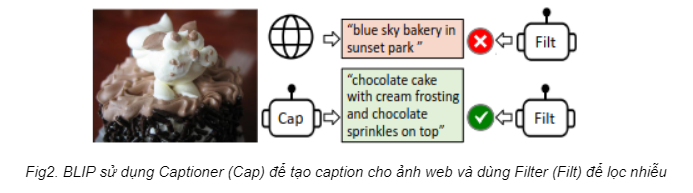 Về mặt dữ liệu, BLIP sẽ sử dụng chính các khối kể trên để làm 2 mô hình Captioner và Filter nhằm xử lý nhiễu trong bộ dữ liệu cào được trên mạng. Một mô hình thì chuyên miêu tả trong ảnh có gì (Captioner) và một mô hình thì chuyên kiểm tra xem ảnh và caption có liên quan không (Filter). Lấy ví dụ như trong Fig2, alt-text thu thập được từ web không hề liên quan đến ảnh (bầu trời với bánh kem). Lúc này, Filter sẽ từ chối alt-text trên và nhiệm vụ của Captioner sẽ tạo ra một alt-text khác phù hợp hơn.