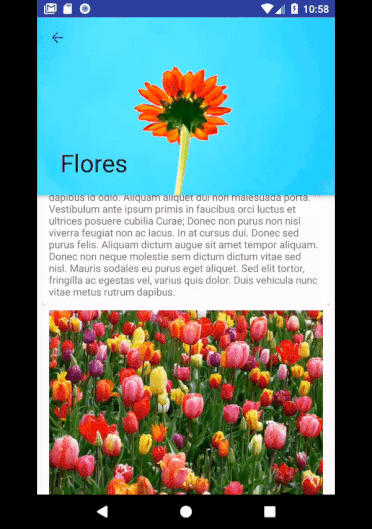 Nếu các flags này được sử dụng một cách độc lập, riêng mình nó thì CollapsingToolbar sẽ có cùng một biểu hiện tương đồng nhau (như ảnh dưới). Điều này có lẽ sẽ khiến cho các bạn thắc mắc liệu giữa chúng có điểm gì khác biệt không? Để thấy được sự khác biết ấy, chúng ta sẽ cần phải kết hợp chúng lại với flag scroll. Khi mỗi flag trên được kết hợp chung với scroll thì nó sẽ làm cho CollapsingToolbar có những hành vi khác nhau mỗi khi ta vuốt màn hình.