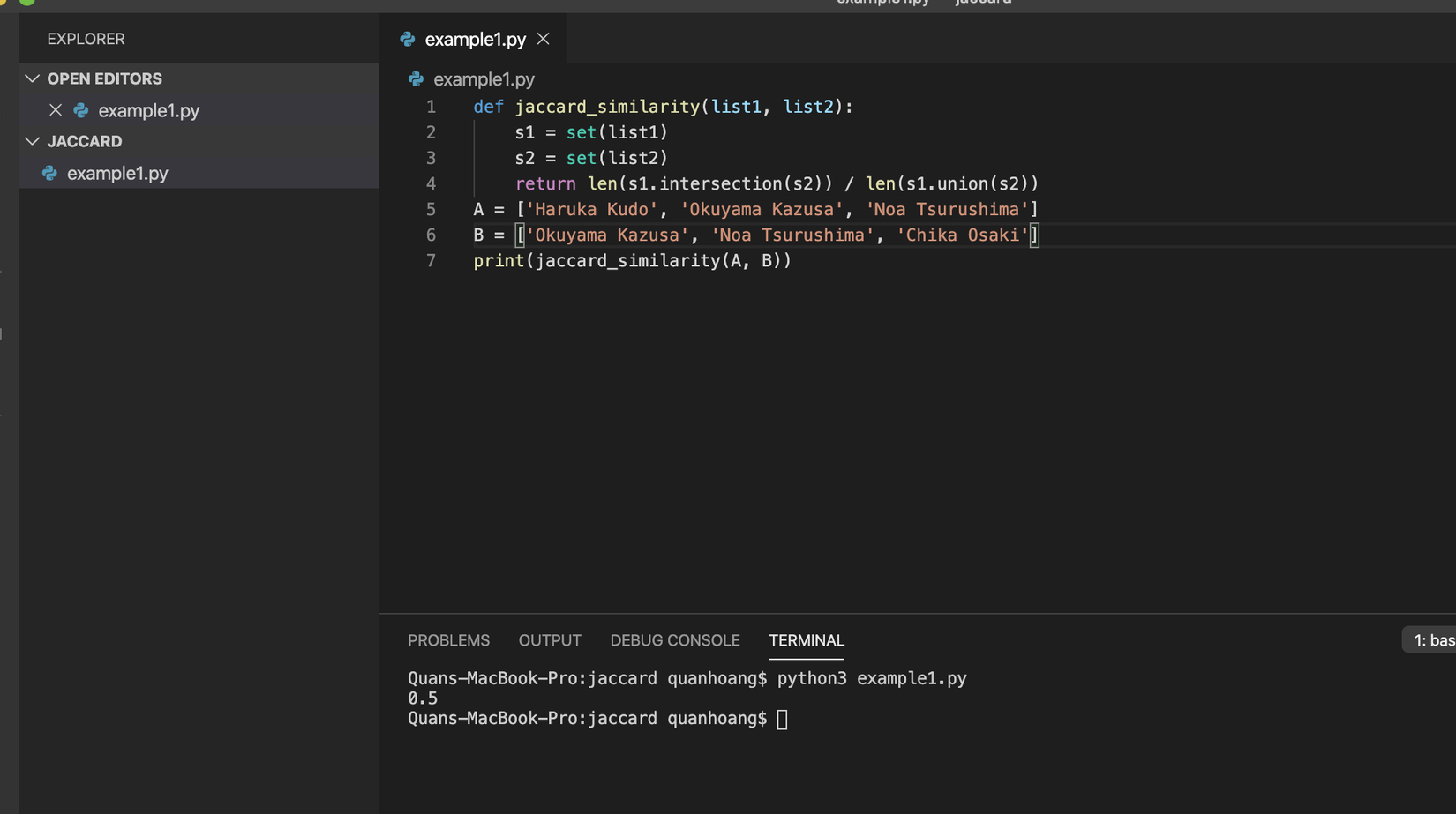 Đầu tiên là việc cài đặt thuật toán. Việc này khá đơn giản(thực ra cũng có hàm jaccard có sẵn trong python rồi, nhưng chúng ta sẽ thử cài đặt từ đầu)