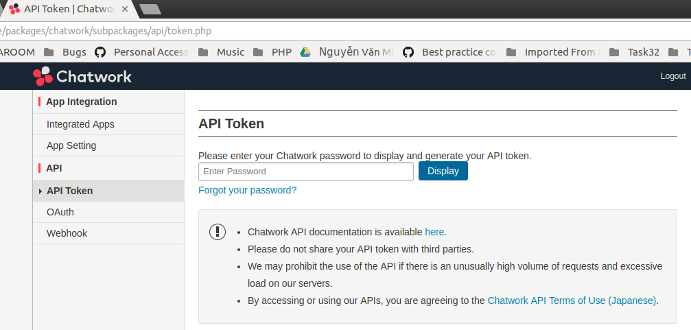 Để phục vụ cho việc bắn thông báo về chatwork trước tiên bạn phải biết về chatwork API, bạn phải tạo ra 1 nick chatwork rồi sử dụng token của nó để có thể gửi thông báo về box chat đã.