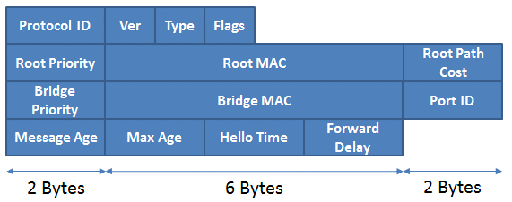 • Trong STP các switch sẽ liên lạc với nhau thông qua gói tin BPDU, sau đây là BPDU header.