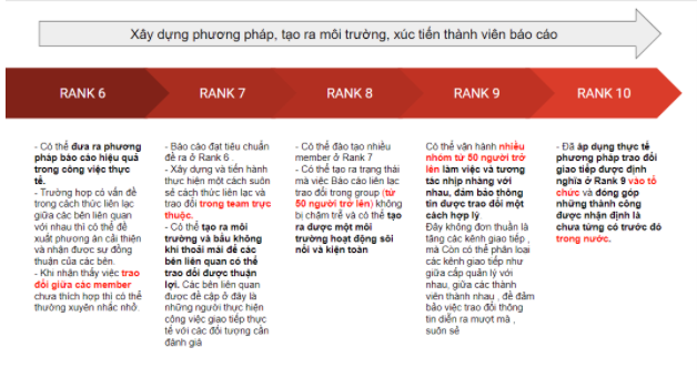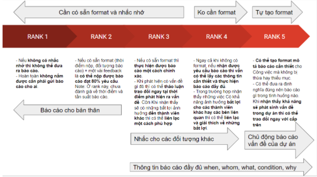 “Báo cáo“: Khi gặp vấn đề, ngay lập tức báo cáo cho người lãnh đạo gần nhất (trưởng phòng hoặc nhóm trưởng). Báo cáo ngắn gọn tình huống đang gặp phải, tình trạng của vấn đề, hướng giải quyết vấn đề đang gặp phải: đang xử lý như thế nào, xử lý đến đâu…Nếu có nhiều hướng giải quyết thì báo cáo lại để cấp trên lựa chọn hướng giải quyết tốt nhất, và cả nhóm sẽ theo hướng giải quyết đó.
