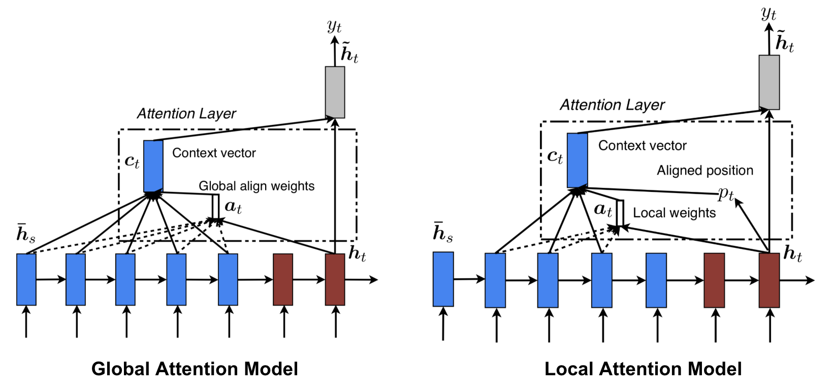 Global Attention: Tất cả các trạng thái ẩn của bộ mã hóa được xem xét để tạo ra vector trung gian.