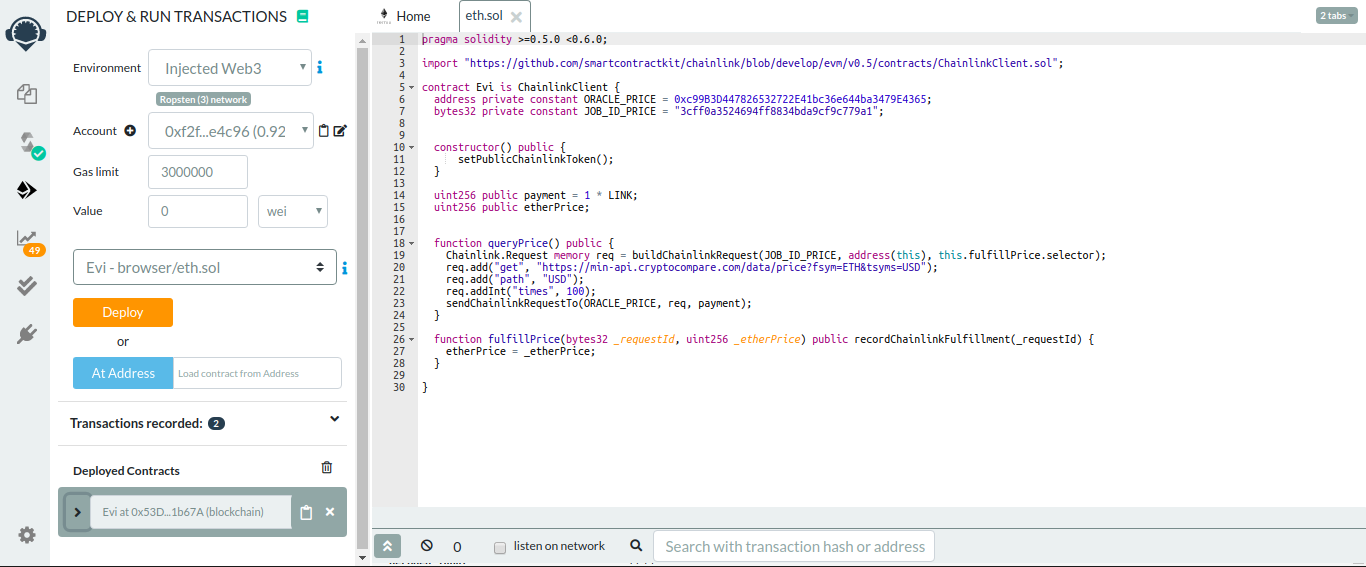 - Contract của chúng ta tên là Evi và thừa kế từ contract ChainlinkClient (để có thể sử dụng chainlink).