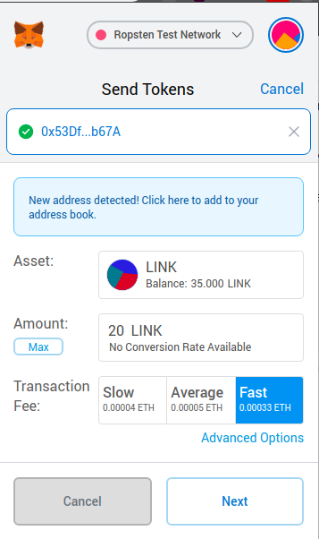 Bước 2: Sau khi deploy xong, chúng ta sẽ gửi LINK token vào contract (để làm phí gửi cho oracle contract sau này). nếu tài khoản chưa có LINK token, chúng ta có thể faucet tại https://ropsten.chain.link/