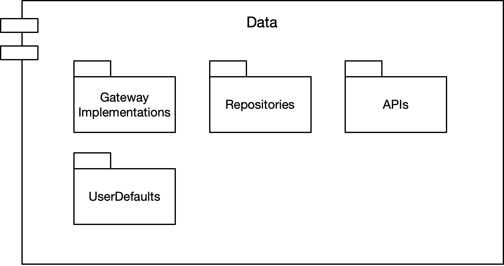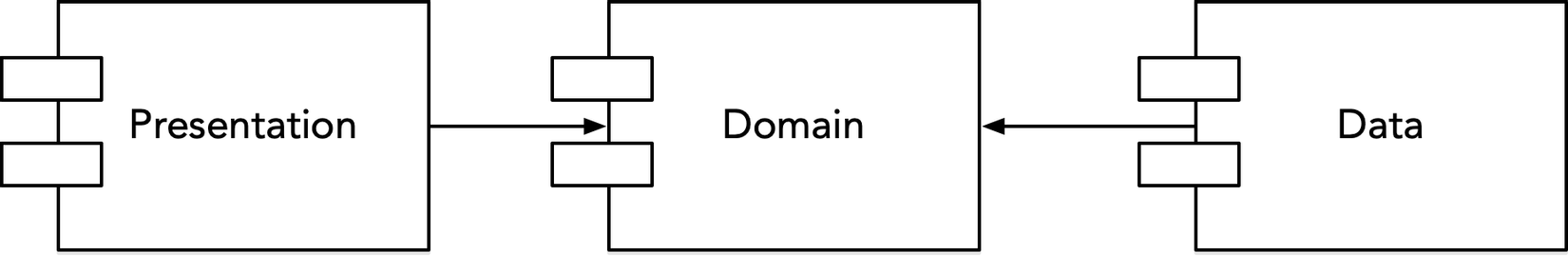 Lớp Data chứa các triển khai Gateway và 1 hoặc nhiều Data Stores. Gateway là phản hồi cho dữ liệu điều phối từ những Data Store. Data Store có thể online hoặc offline (ví dụ presistent database). Lớp Data chỉ phụ thuộc vào lớp Domain.