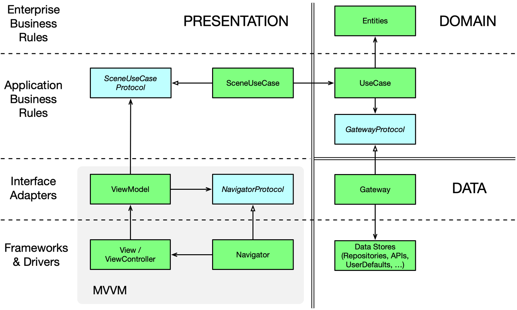 - Presentation Layer: ViewModels + Views+ Navigator + Scene Use Cases