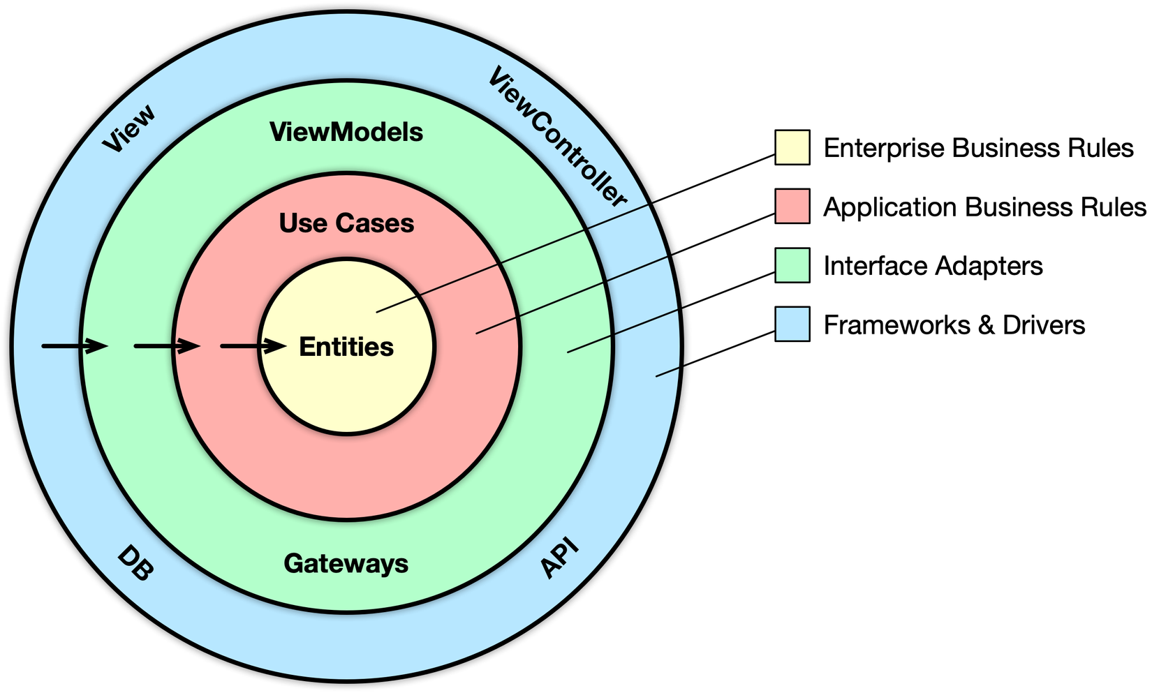 Chứa các Business logic. Là lớp quan trọng nhất, nơi bạn thực hiện giải quyết các vấn đề - mục đích khi xây dựng app. 1 entity có thể là 1 object với các phương thức, hoặc nó là 1 tập hợp của struct và hàm. Điều đó không quan trọng, entities có thể sử dụng bởi nhiều cách khác nhau trong cùng 1 ứng dụng. Entites có thể đơn giản là dữ liệu structures: