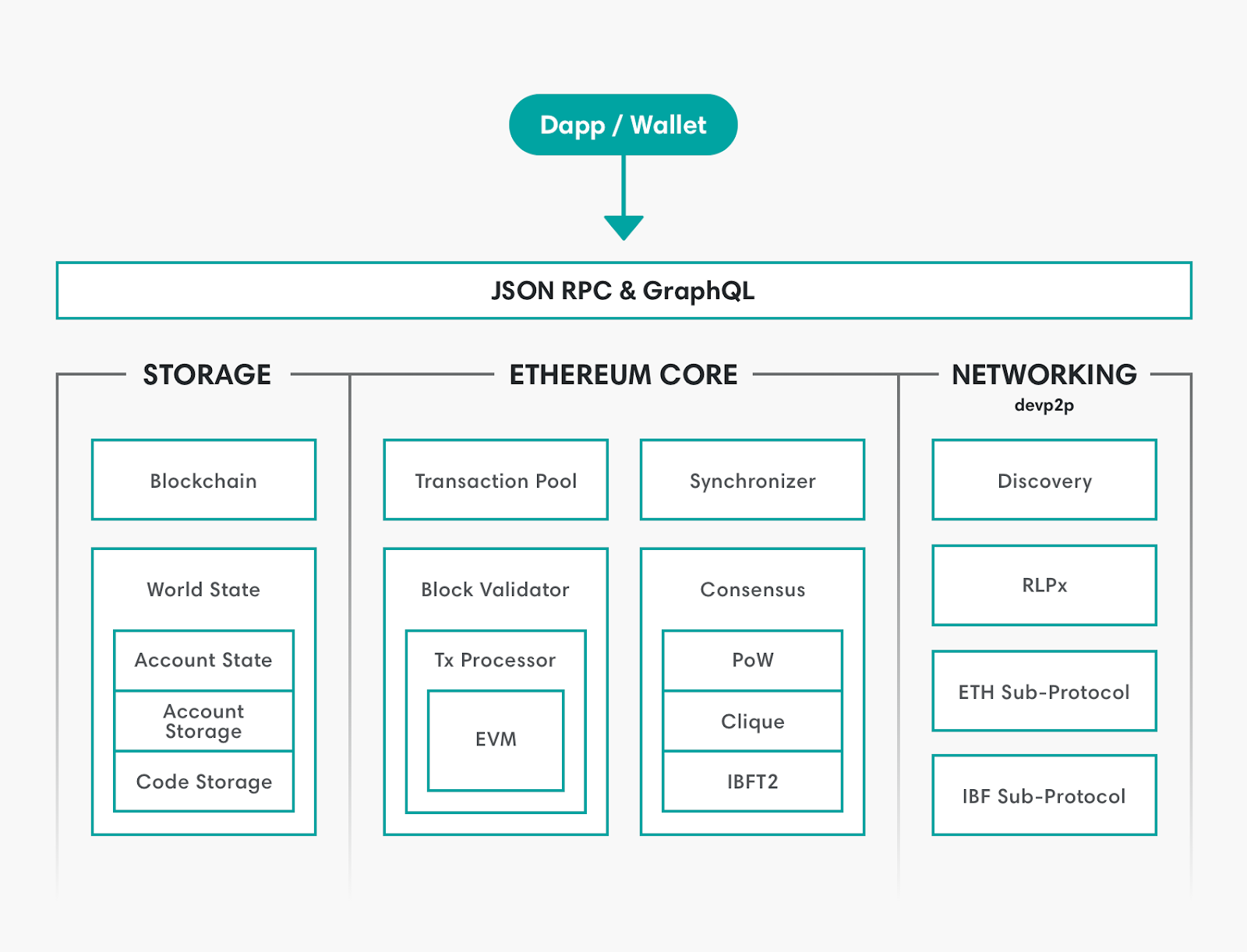 Kiến trúc của Besu chia ra làm 4 phần chính là Storage, Ethereum Core , Networking và User-facing APIs