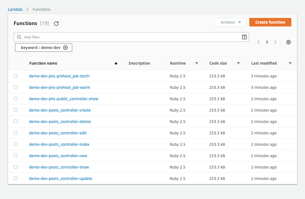 Jets hỗ trợ việc viết các hàm của AWS Lambda với Ruby. Bạn có thể định nghĩa chúng trong thư mục app/functions. Ví dụ: