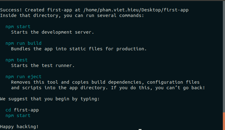 Tiếp theo như console trong hình đã hướng dẫn chúng ta vào thư mục vừa create và dùng npm start để chạy react nhé !